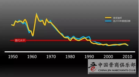 根据2010年中国人口普查数据,中国的生育率,在1990年左右,跌破了“替代水平”。