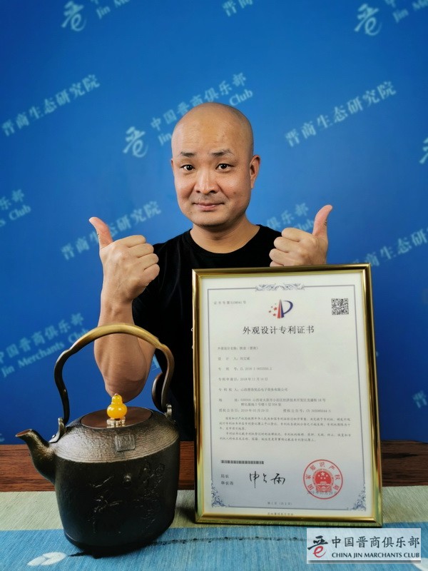 中国晋商俱乐部秘书长与晋商铁壶及专利证书合影