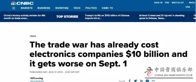 特朗普的对华新关税即将于当地时间周日(9月1日)生效,CNBC当天给特朗普算了一笔账,强调“贸易战已经让(美国)电子公司损失了100亿美元(约合715亿元人民币),而9月1日(开始)情况将更糟”。CNBC还说,(美国)消费者的钱包将开始受到冲击。