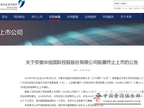 现在,深交所给出了自己的决定。9月4日,深交所发布《关于安徽华信国际控股股份有限公司股票终止上市的公告》称,根据《深圳证券交易所股票上市规则(2018年11月修订)》第14.4.1条第(十八)项、第14.4.2条的规定以及本所上市委员会的审核意见,2019年9月4日,本所决定公司(*ST华信)股票终止上市,并自2019年9月12日起进入退市整理期。退市整理期的期限为三十个交易日,退市整理期届满的次一交易日,本所对公司股票予以摘牌。