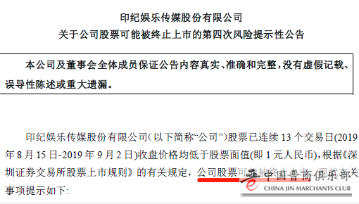 9月2日晚,*ST印纪发布了第四次风险提示公告,称股票已连续 13个交易日(2019年8月15日-2019年9月2日)收盘价格均低于股票面值)(即 1元人民币),根据《深圳证券交易所股票上市规则》的有关规定,公司股票可能被终止上市。