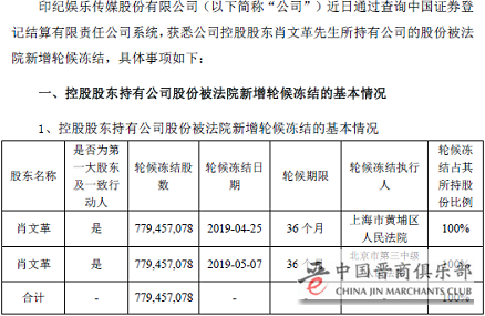 可是现在,“首富”肖文革却是十分头疼。今年的5月15日,印纪传媒发布了《 关于控股股东股份被轮候冻结的公告》称,公司控股股东肖文革所持全部公司股份7.79亿股先后被上海市黄浦区人民法院、北京市第三中级人民法院轮候冻结,轮候冻结期为3年。而这已是肖文革所持股份第7次被轮候冻结。