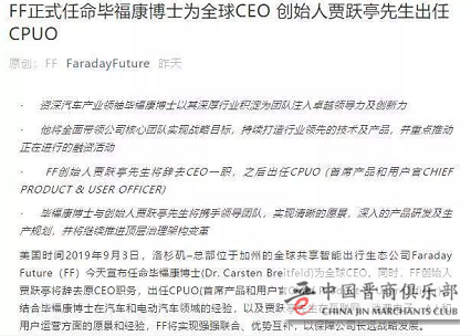 9月3日,FF正式发布公告,任命毕福康博士(Dr. Carsten Breitfeld)为全球CEO。同时,贾跃亭将辞去原CEO、董事长职位,出任CPUO (首席产品和用户官Chief Product & User Officer),负责互联网生态系统战略的整体落实,领导人工智能、产品定义、用户获取、用户体验和用户运营等相关工作。此外,FF还将公开招募全球董事长一职。