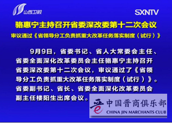 9月9日,山西省委书记、省人大常委会主任、省委全面深化改革委员会主任骆惠宁主持召开省委深改委第十二次会议,审议通过了《省领导分工负责抓重大改革任务落实制度(试行)》。省委副书记、省长、省委全面深化改革委员会副主任楼阳生出席会议。