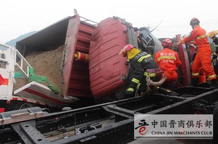 事故共造成8车受损,大货车驾驶人、40岁的句容男子武某受伤后,血流不止,被卡在侧翻的车头内。