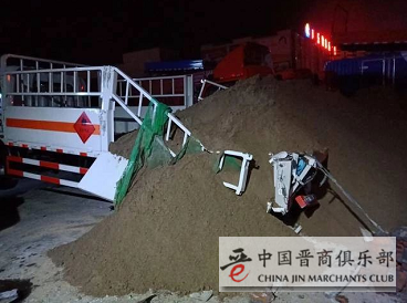 为避让一辆转弯的半挂车, 一辆满载沙子的苏L号牌重型自卸货车,先与一辆小轿车刮碰,接着又与半挂车碰撞后冲到路边。随即,侧翻在某汽车商店的停车场旁边,造成停车场内其他5辆新车受损。
