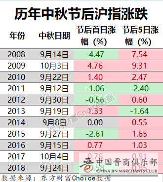数据显示,自2008年中秋节被确定为法定节假日以来,上证指数在中秋节后的首个交易日是六涨五跌一平,并无明显规律。