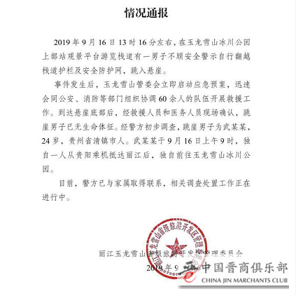 事件发生后,玉龙雪山管委会立即启动应急预案,迅速会同公安、消防等部门组织协调60余人的队伍开展救援工作。到达悬崖底部后,经救援人员和医务人员现场确认,跳崖男子已无生命体征。经警方初步调查,跳崖男子为武某某, 24岁,贵州省清镇市人。武某某于9月16日上午9时,独自一人从贵阳乘机抵达丽江后,独自前往玉龙雪山冰川公园。