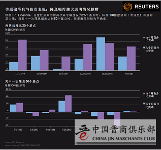 LPL Financial资深市场分析师Ryan Detrick指出,在过去40年中,当宽松周期的前两次降息幅度仅有25个基点时,标普500指数在其后六个月和12个月均呈现上涨。而当其中一次的降息幅度达到50个基点时,股市的表现就更加不确定。