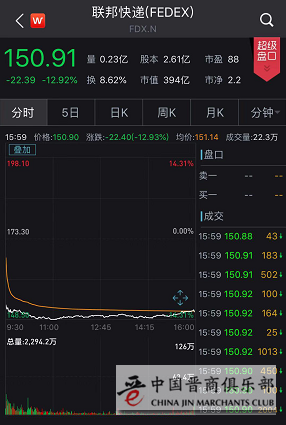 联邦快递股价上演“大跳水”。昨夜美股盘中,联邦快递(FEDEX)股价一路断崖式下跌,盘中一度跌幅超14%,收盘跌幅12.93%,报收150.91美元,总市值蒸发约58亿美元(合计人民币412亿元),创下2008年12月以来以来最大单日跌幅。