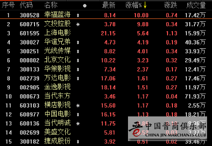 9月23日,影视板块个股集体拉升,幸福蓝海直线拉升封板,文投控股涨停,上海电影涨逾5%,华谊兄弟、光线传媒涨幅超过4%,北京文化、华策影视等纷纷跟涨。