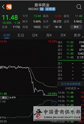 同时,同样跌停的还有恩华药业,收报11.48元。据报道,4+7药品带量采购全国扩面结果公布,利培酮口服常释剂型产中,符合条件的企业有5家,分别是华海药业、齐鲁制药、恩华药业、常州四药和强生,但最终中标的是华海药业、齐鲁制药和常州四药,恩华药业和强生未能中标。