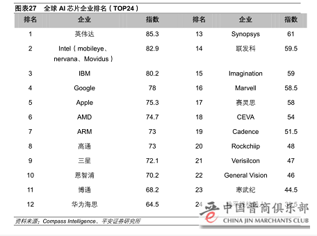 平安证券研报指出,在 AI Chipset Index TOP24 榜单中,前十依然是欧美韩日企业,国内芯片企业如华为海思、联发科、Imagination(2017年被中国资本收购)、寒武纪、地平线机器人等企业进入该榜单,其中华为海思排 12 位,寒武纪排 23 位,地平线机器人排 24 位。