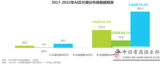 根据中金公司研究部数据显示,2017年整体AI芯片市场规模达到62.7亿美元,到2022年,AI芯片市场规模将会达到596.2亿美元。