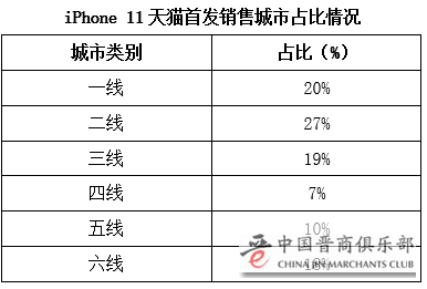 数据显示,购买预售iPhone11的用户中,80%是新客(最近一年没有在天猫平台买过苹果手机的用户)。其中,占比最多的是二线城市为27%,三线及以下城市用户占比54%。值得注意的是,六线城市买家占比18%,与一线城市占比数额20%相当。