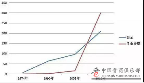 要知道 1974 年一块 1 公斤的金砖可以买到半吨重的虫草,而到了 2010 年,同样的一块金砖可能连等重的虫草都买不起了。