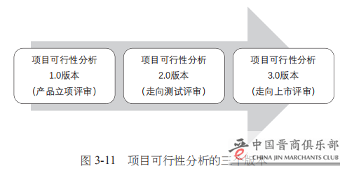 随着开发过程中了解信息的深入和完善,项目团队需要对可行性分析报告进行及时的更新和调整。在走向测试和走向上市的评审点,决策评审团队都要将更新后的项目可行性分析报告作为决策依据(见图3-11)。