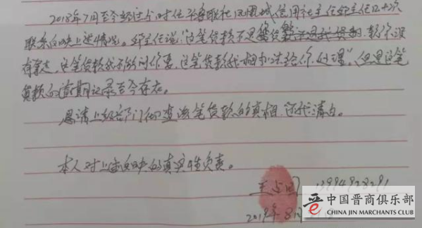 2019年8月21日,王占国前往邱主任(现任平鲁农信社西水界乡信用社主任)办公地址询问自己“被贷款”一事处理进度。邱主任回忆,对于这笔2万元的贷款,是当时理事长让放的,自己经办,是平鲁城一个名为赵正(谐音)的人拿着王占国的身份证原件来贷的款,不是王占国本人来办理的贷款,赵正(谐音)来办的时候声称王占国是自己的亲友,具体原件是真是假,还是王占国本人借给的,现在也说不清,追究也没有意义。