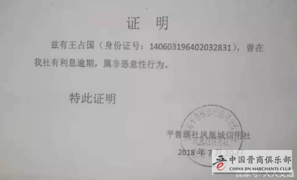 图:平鲁农信社凤凰城信用社为王占国出具的所谓“证明”,称拿着这个就可以向上级申请取消信用不良记录。
