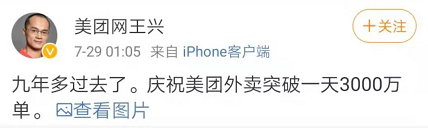 7月29日,王兴还在其个人微博上表示:九年多过去了。庆祝美团外卖突破一天3000万单。