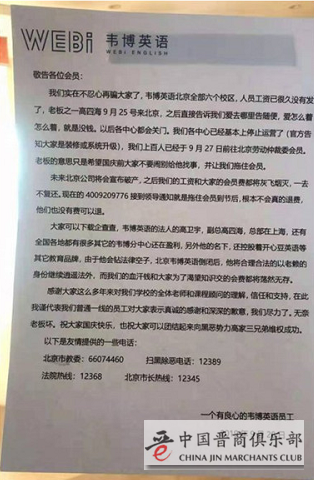 9月28日,一位自称是“有良心的韦博英语员工”贴出公告称,韦博英语北京公司将宣布破产,北京各中心已以装修或系统升级的名义停止运营,学员会员费与员工工资均无处追讨。