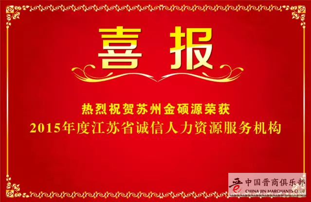 近日,从江苏省人力资源和社会保障厅获悉,苏州金硕源人力资源服务有限公司在2015年度全省诚信人力资源服务机构评比中脱颖而出,荣获“2015年度全省诚信人力资源服务机构”称号。此次评选是根据省厅《关于在人力资源服务机构中开展诚信服务主题创建活动的通知》(苏人社发〔2013〕163号)精神,全省各类经营性人力资源服务机构在开展以“诚信服务树品牌、规范管理促发展”为主题创建活动中,努力提升服务水平,创建服务品牌,有力地推动了我省人力资源服务机构诚信体系建设,促进了人力资源服务业的发展。通过机构自评申报、台账预审、综合评分,并广泛征求机构所在地工商、税务、社会保险、劳动监察部门意见及集中公示,认定苏州金硕源人力资源服务有限公司为2015年度全省诚信人力资源服务机构。