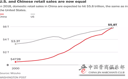 近几年,中国消费持续增长(下图中红线),并在2018年,与美国的零售商品总额基本持平,同为5.8万亿美元。