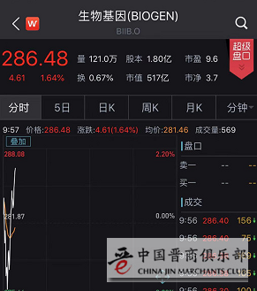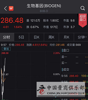 昨晚Biogen股票激增26.11%,市值大涨107亿美元(约合人民币750亿元)。今天美股开盘继续上涨。截至记者发稿,涨幅1.64%。