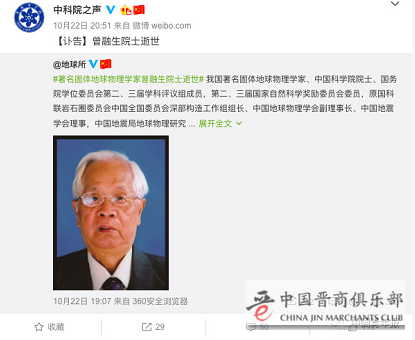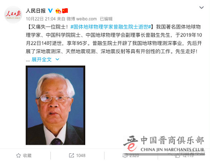 据中国地震局地球物理研究所官方微博发布的消息,我国著名固体地球物理学家、中国科学院院士、中国地球物理学会副理事长曾融生先生,于2019年10月22日14时逝世,享年95岁。