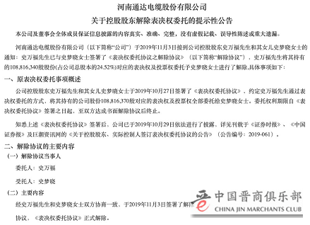 然而昨晚的一纸公告,却将此前签订的协议废除。公告表示,经史万福和史梦晓双方协商一致,于2019年11月3日签署了解除协议,《表决权委托协议》正式解除。