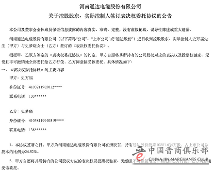 几天前,史万福与女儿史梦晓签定的《表决权委托协议》约定,史万福自愿将其所持有的公司股权对应的表决权及投票权独家、无偿且不可撤销地全部委托给史梦晓行使,史梦晓同意接受该委托。