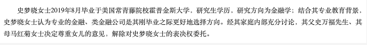 史梦晓出生于1994年,今年25岁,2019年8月毕业于美国常青藤院校霍普金斯大学,研究生学历,研究方向为金融学。