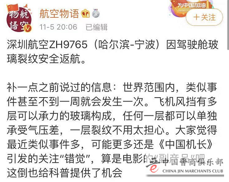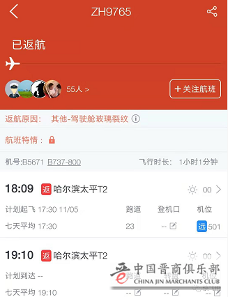 11月5日,哈尔滨飞宁波的航班,18:09起飞后,19:10返航回到哈尔滨,因驾驶舱风挡玻璃发现裂纹……