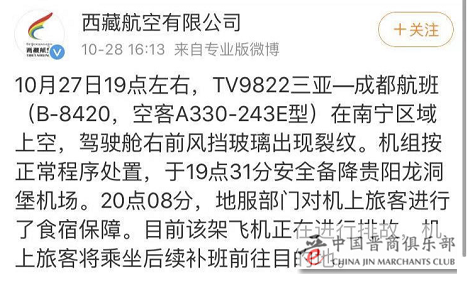 此前,相同情况也曾上演。10月27日,西藏航空TV9822三亚—成都航班,驾驶舱右前风挡玻璃出现裂纹备降贵阳。有乘客透露,备降期间无异常,落地后被通知航班取消。
