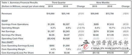 10月23日,波音发布2019年三季报。财报显示,波音公司第三季度营收近200亿美元,同比下滑21%;前三季度净利润为3.74亿美元,同比下降95%。