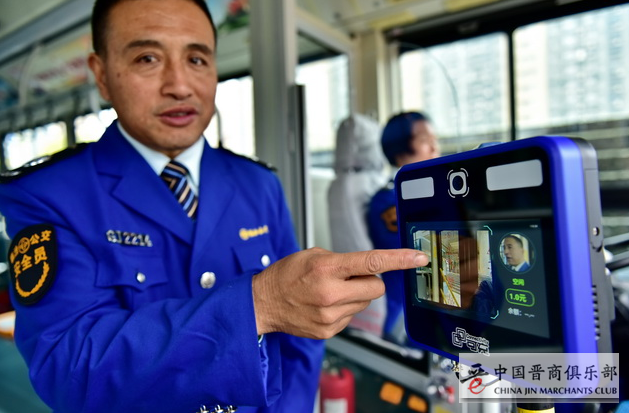 11月6日,山西省临汾市,临汾公交司乘人员向记者介绍先进的面部识别刷卡系统。摄影/章轲