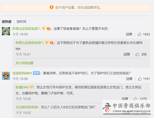 “哎呀呀,你这个5:00-20:00的限制是歧视我们女性啊,为什么不能一视同仁呢”;“禁止女性打车叫保护女性,照你们的理论国家应该禁止女性出门”;“这不就相当于为了避免出现强奸案让所有女性都穿长衣长裤吗”。