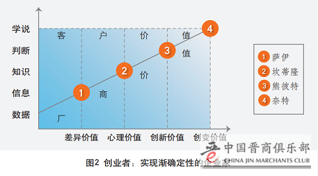 “不确定性”和“创业”往往是联系在一起的两个概念。历史上,四位创业经济学家从不同侧面解释创业者的共性在于提炼价值信号,沟通价值信号,建立市场对价值信号的接受和共识。通过上述的信号活动,创业者把被一般人视为不确定的市场机会转化为确定的产品和服务,见图2。