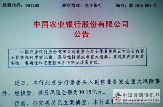 中国农业银行(2.950, 0.00, 0.00%)1月22日晚间发布公告,近日,农业银行北京分行票据买入返售业务发生重大风险事件,经核查,涉及风险金额为39.15亿元。此前财新网的报道提及,这些票据被换成报纸存在了银行保险箱里。
