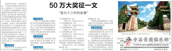 据媒体报道,这个“50万大奖征一文”,是由湖南省十三村食品有限公司举办的“我与十三村的故事”有奖征文活动,征文时间为2018年10月10日至2019年10月10日。