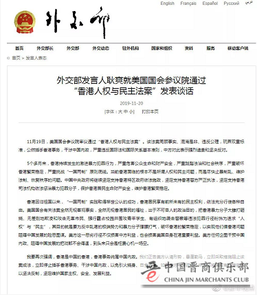 11月19日,美国国会参议院审议通过“香港人权与民主法案”。该法案罔顾事实、混淆是非、违反公理,玩弄双重标准,公然插手香港事务,干涉中国内政,严重违反国际法和国际关系基本准则,中方对此表示强烈谴责和坚决反对。