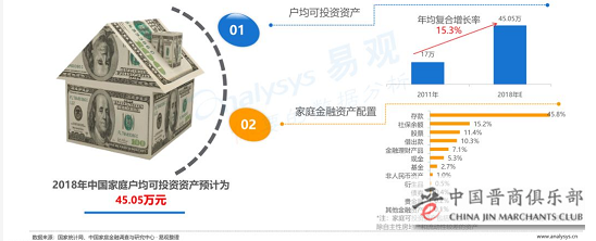 近年来,随着人均可支配收入的快速增长,中国家庭的可投资资产规模也保持了较快增长。根据Analysys易观&唯品金融此前联合发布的《2018中国家庭金融市场分析报告》,2018年中国家庭户均可投资资产预计为45.05万元。