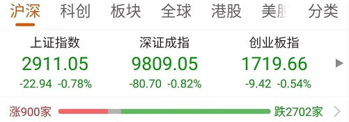 本周三,在经历连续两天的上涨后,日内A股出现回调,截至收盘,沪指跌0.78%,深成指跌0.82%,创业板指跌0.54%。