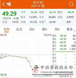 本周三,拉卡拉小幅低开,整个早盘在平盘线下方窄幅震荡,午后一开盘,感觉就不对了,股价快速向下跳水,13点40左右在巨量卖单推动下直接封死跌停,至收盘尚有1.4万手封单封死跌停,约合6700万元资金。其最新市值197亿元,较前一日的219亿元,一天就蒸发了22亿元。