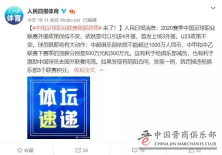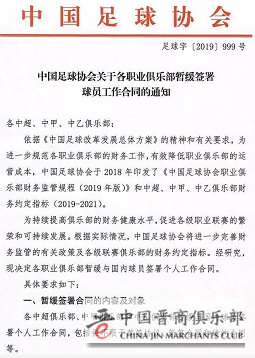 3、为方便各俱乐部工作平稳开展,特向各职业俱乐部下发通知,在新的政策调整正式公布之前,暂缓各职业俱乐部与球员签署新的工作合同。
