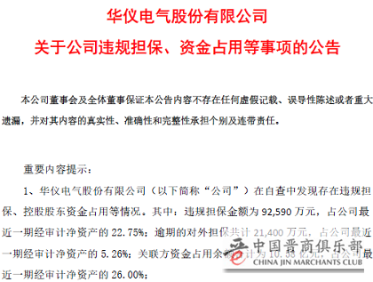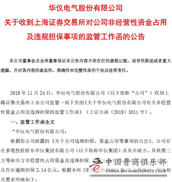 此外,在华仪电气的自查公告中,华仪电气表示控股股东华仪集团已经承诺会在公告披露之日起一个月内解决上述上市公司对外担保和资金占用的问题。