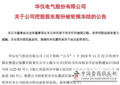 可问题在于,11月22日晚,华仪电气刚刚发布公告称,截至本公告日,华仪集团持有公司股份2.34亿股,占公司总股本的30.83%,处于质押状态的股份数量2.34股,占其持有公司股份总数的99.9963%,处于冻结状态的股份数量为2.34股,占其持股总数的100%;累计轮候冻结数为 2.98亿股,占其持有公司股份总数的127.01%。