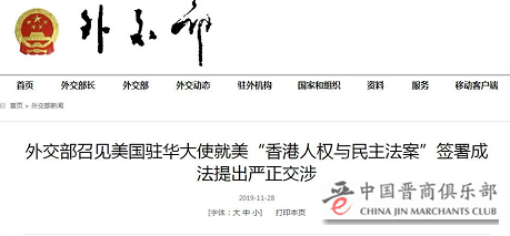 2019年11月28日,中国外交部副部长乐玉成召见美国驻华大使布兰斯塔德,就美“香港人权与民主法案”签署成法提出严正交涉和强烈抗议。