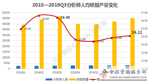 截止至2019年三季度末,平均每位分析师发布的研报数量也14.11篇,远低于去年同期水平,不知是否受到了分析师评选活动叫停的影响。