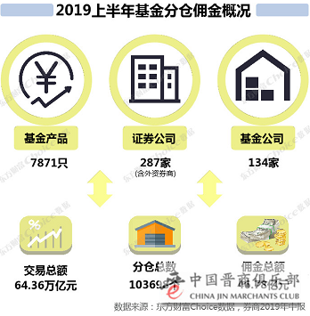 截止至2019年中报,134家基金公司旗下7871只基金产品一共由287家(含外资)证券公司分仓交易,共分成103698个交易席位。交易总额64.36万亿元,其中股票交易金额5.73万亿元,债券交易金额1.28万亿元,回购交易金额57.36万亿元。分仓佣金总额共计46.78亿元。